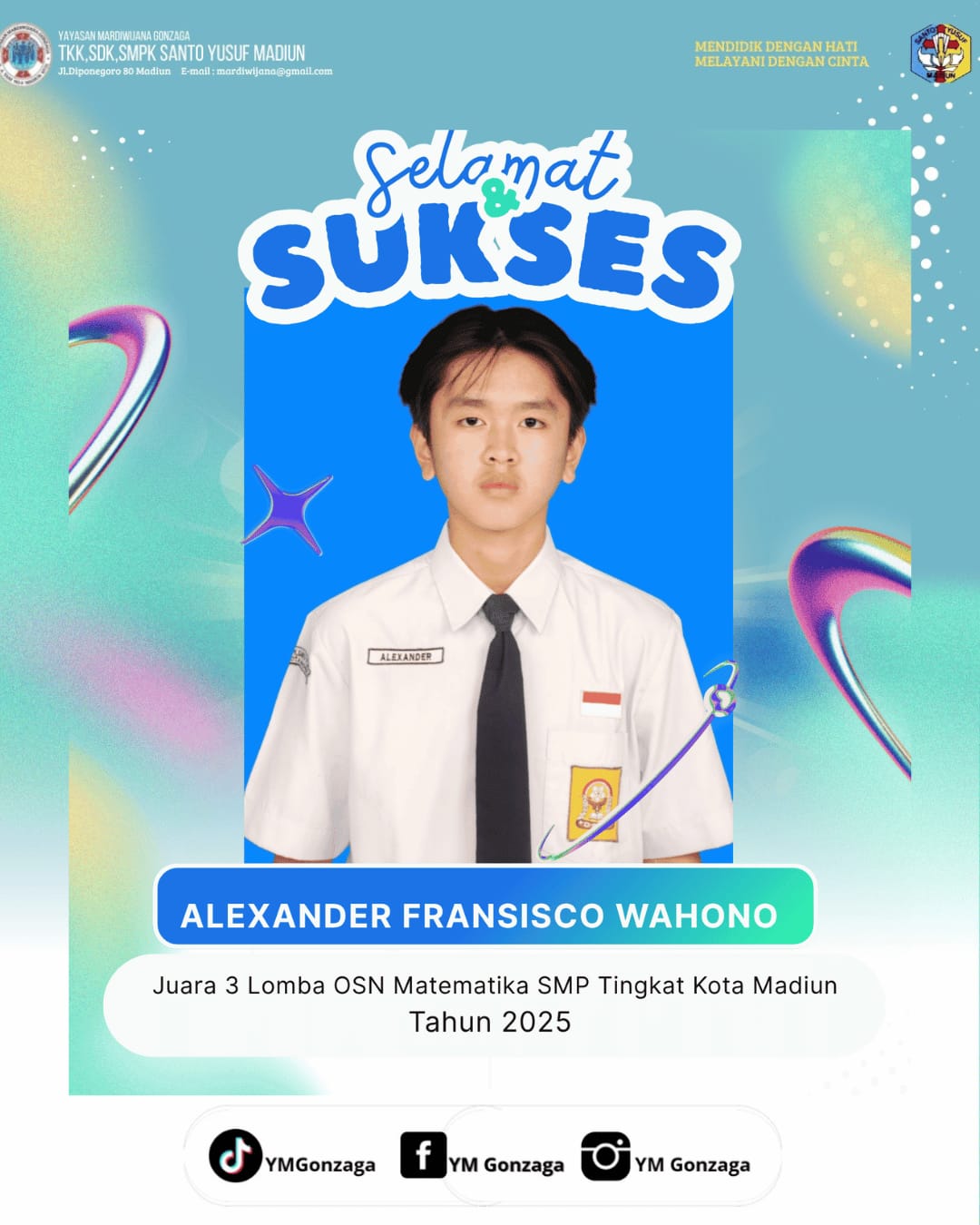 ![]() | Olimpiade Sains Nasional (OSN) Tingkat SMP Tahun 2025 Atas nama : Alexander Fransisco Wahono Juara 3 OSN Mapel Matematika Tingkat Kota Madiun Tahun 2025 |